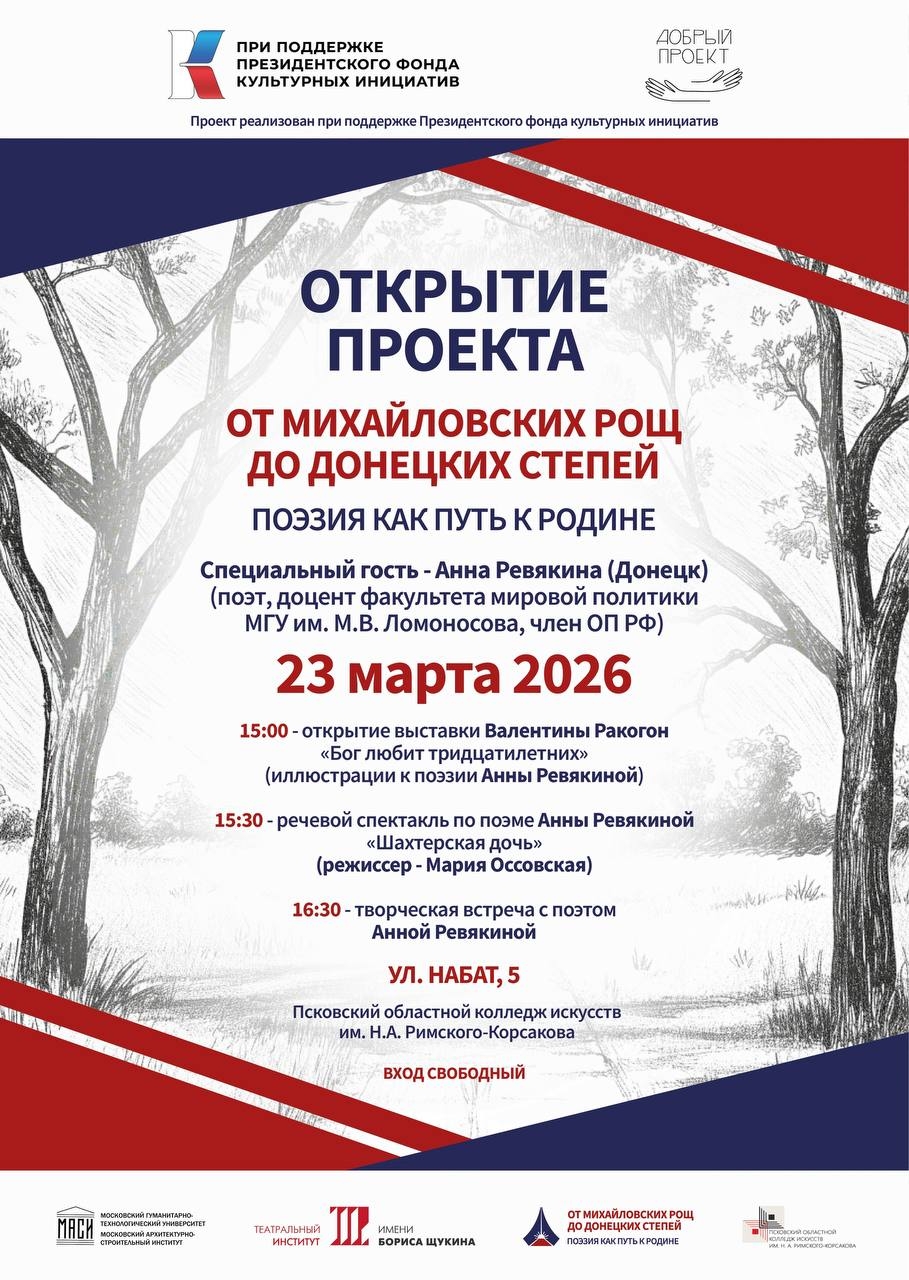 ГАОУ ДО «Лидер» сообщает о предстоящем открытии проекта «От михайловских рощ до донецких степей», организованного Псковским областным колледжем искусств им. Н.А. Римского-Корсакова. Мероприятие состоится 26.03.2026 в 15:00 по адресу: ул Набат д 5.